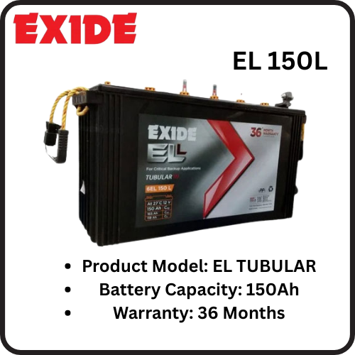 Exide EL 150L inverter battery with 150Ah capacity for long backup, fast charging, and low maintenance. Ideal for home and office inverter systems.