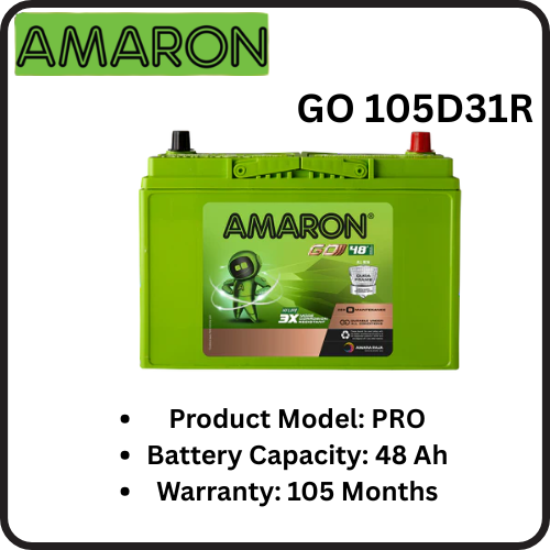 The Amron PRO 105D31R is a high-capacity, maintenance-free automotive battery engineered to deliver robust starting power, long life, and dependable performance for larger cars, SUVs, and vehicles with higher electrical demands. Designed with advanced calcium alloy technology, this battery combines durability, heat tolerance, and vibration resistance to withstand the challenging driving conditions of Indian roads and weather.