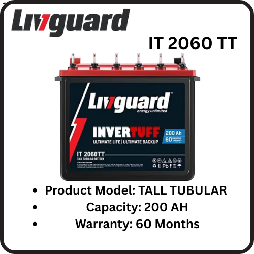Livguard IT 2060TT tall tubular inverter battery (200Ah) for long backup, fast charging, and low maintenance — ideal for home, office, and small commercial power backup solutions.