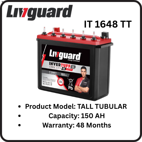 Manufactured by Livguard, the IT 1648 TT features a robust internal design and optimized electrolyte distribution that supports higher heat tolerance, better efficiency, and longer service life. The tall tubular design allows for greater electrolyte volume and plate surface area, resulting in stable output, superior backup duration, and lower maintenance requirements.