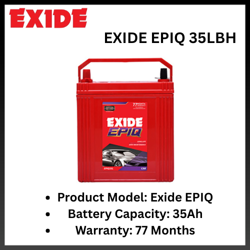 Battery Mantra renders Exide EPIQ 35LBH Battery with 77 Months of full Warranty (42 Months full-Replacement + 35 Months Pro Rata) and Free Delivery services by Today only.